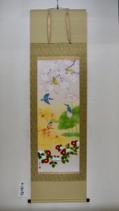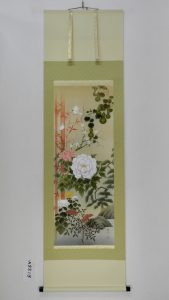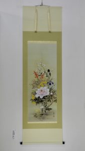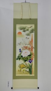 花の王様といわれる牡丹を中心に四季折々の代表的な花が一幅に集約された作品です。春夏秋冬の花々が薫り高く漂い、それぞれの花が生命の息吹を感じさせ見る人の心を生き生きとさせてくれます。季節感の異なる花々をこれから出来るであろう友人たちになぞらえて、人付き合いが円満に進むようにという願いを込めてお飾りいただけます。自然の中では一度に咲きそろうことのない花々ですが、画だからこそ共演できる華やかな世界をお楽しみください。