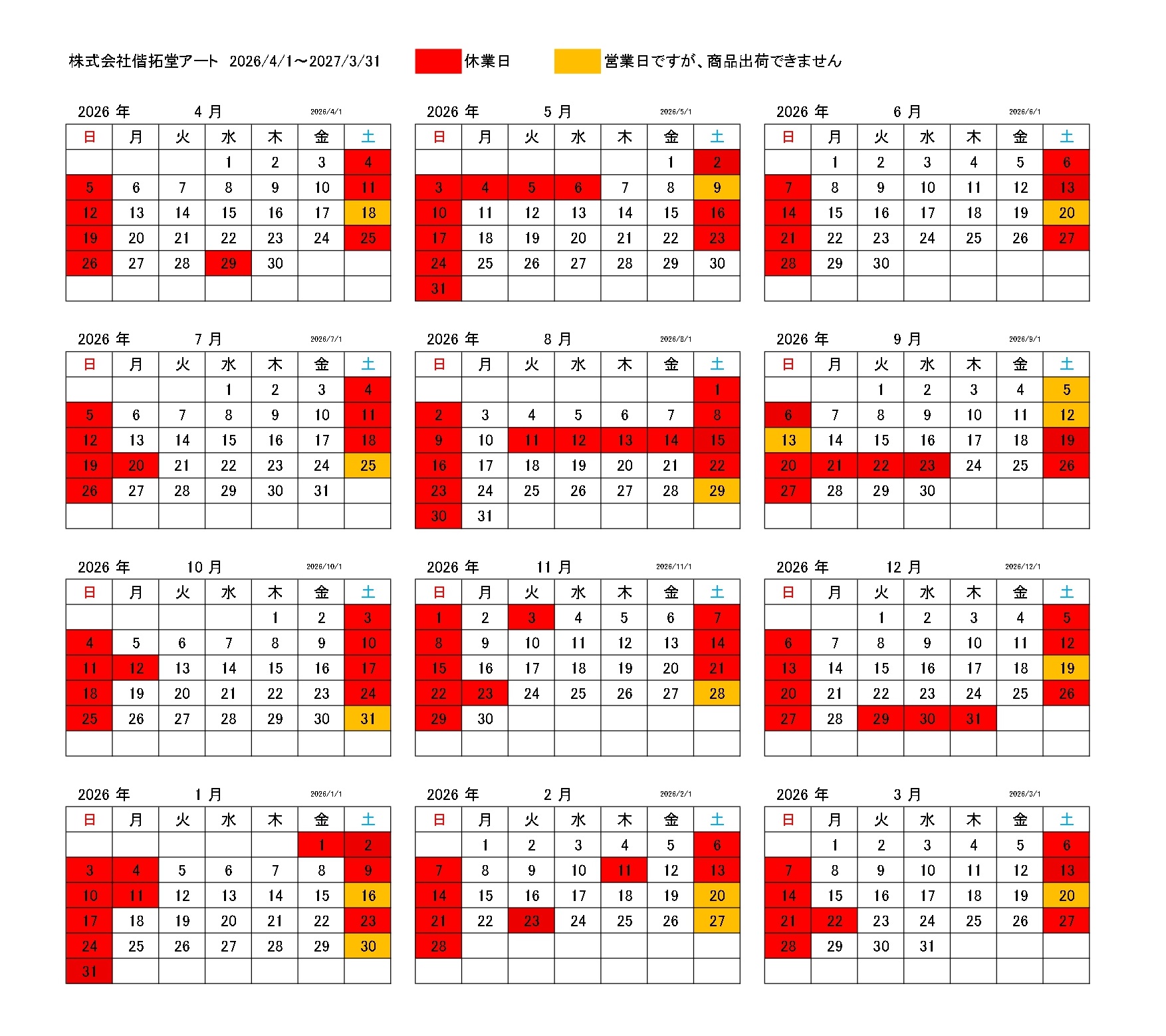 2026年度営業日カレンダー
